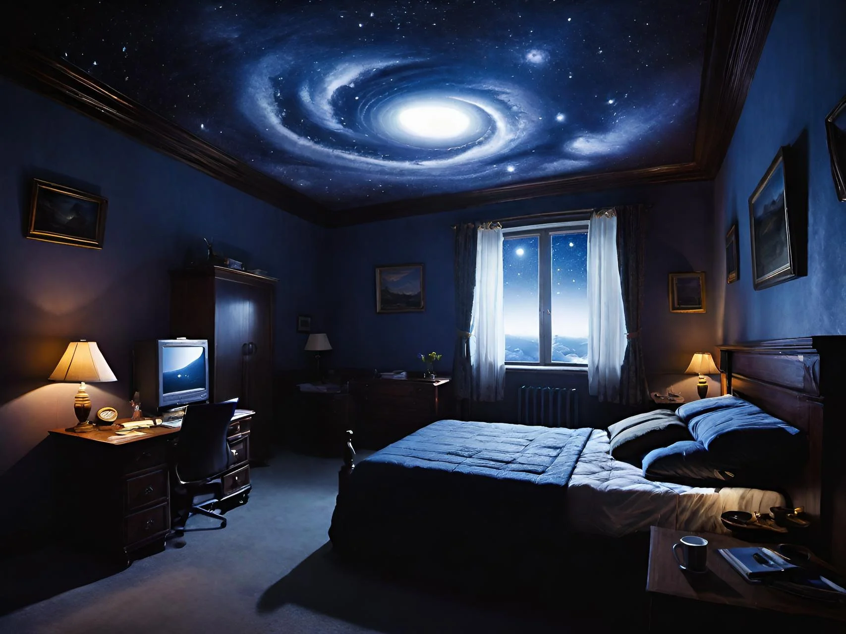 The room was quiet, but sleep never came. Instead, the ceiling above swirled with galaxies, nebulae, and distant stars, all painted in colors that seemed to pulse with a life of their own. It wasn’t just imagination—an AI had mapped the restless patterns of my mind and translated them into cosmic artwork, turning sleepless nights into a living, starlit canvas. Every flicker of light mirrored thoughts that refused to settle, a visual diary of insomnia rendered in glowing hues. Lying in the bed, eyes tracing the constellations above, there was a strange comfort in the chaos. AI had taken the scattered remnants of sleepless nights and made them tangible, almost beautiful. The room became both a sanctuary and a mirror—a place where insomnia was no longer just a torment, but a muse. Stars danced to the rhythm of waking thoughts, and the endless sky overhead whispered that even in the longest nights, there was artistry to be found.