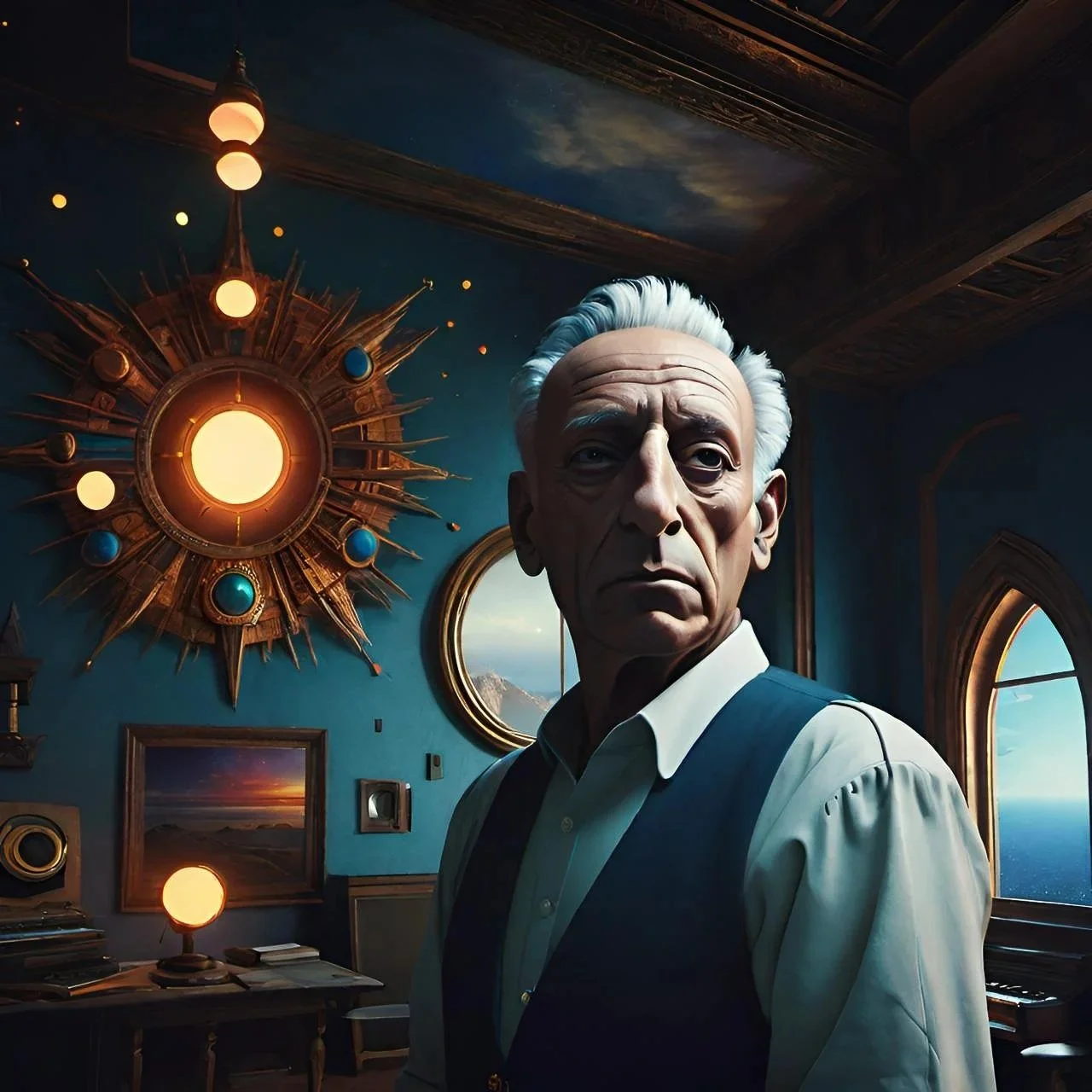 The machine answers with a man lit by an inner sun — frozen somewhere between heartbeat and dawn.